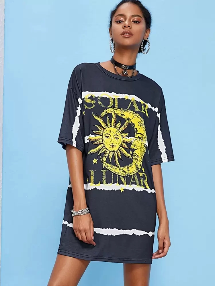 Sun Moon And Letter Graphic T Shirt Dress Shein Usa
