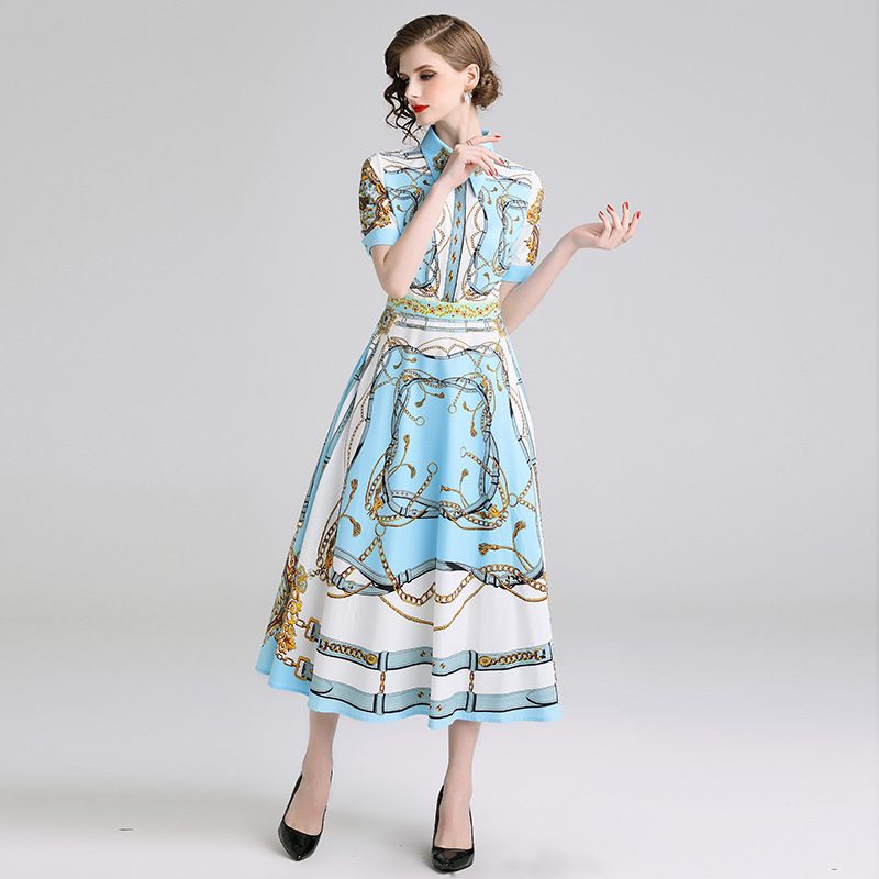 Fashion Design Womens Dress 2019 Court Printing Lapel Short
