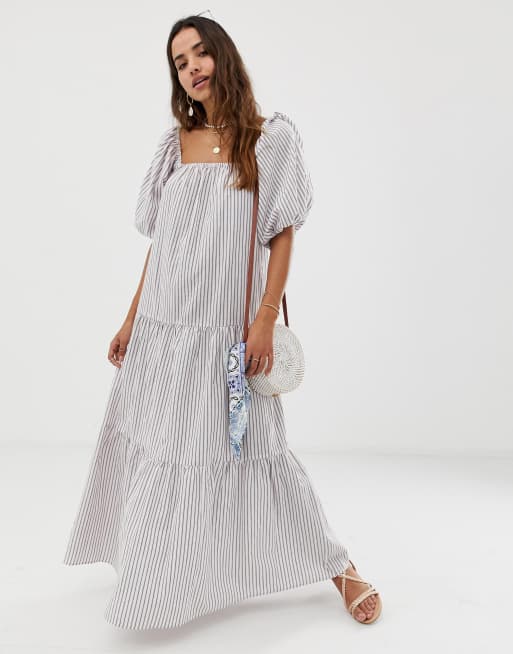 Asos Design Tiered Maxi Dress In Stripe With Puff Sleeve Asos