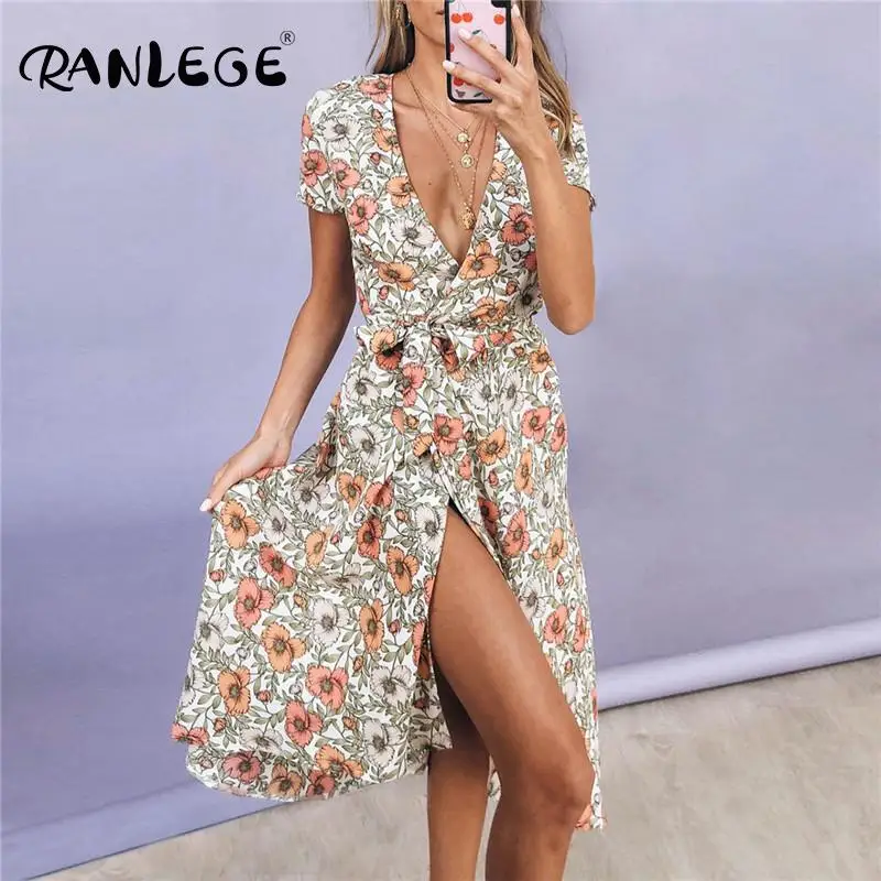 Summer Boho Dress Women Floral Short Sleeve Beach Dress V Neck