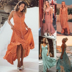 Womens Polka Dot Maxi Boho Dress Floral Summer Beach Evening Party
