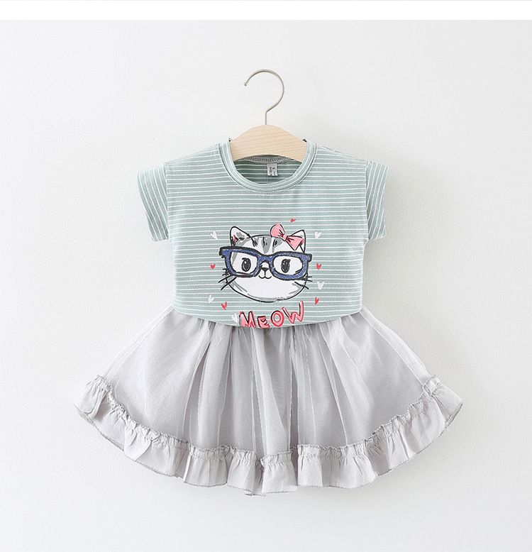 2020 Girls Clothing Cat Stripe T Shirts Skirts Outfits Summer Kids