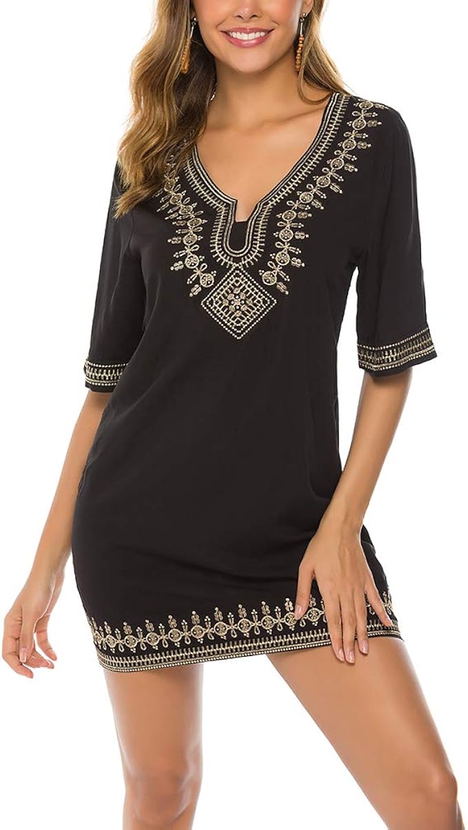 Women S Boho Summer Casual T Shirt Dresses Mexican Embroidered