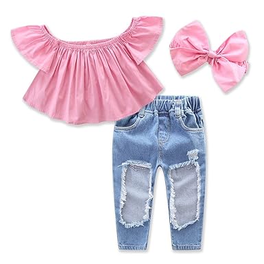 Amazon Com Girls Hole Jeans Trousers Off Shoulder Clothing