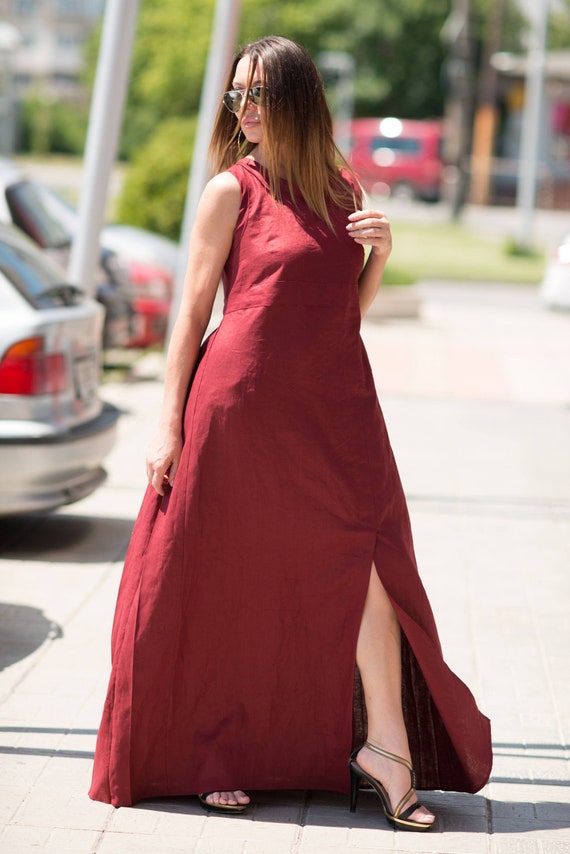 Dark Red Long Summer Dress Long Linen Dress Dark Red Etsy
