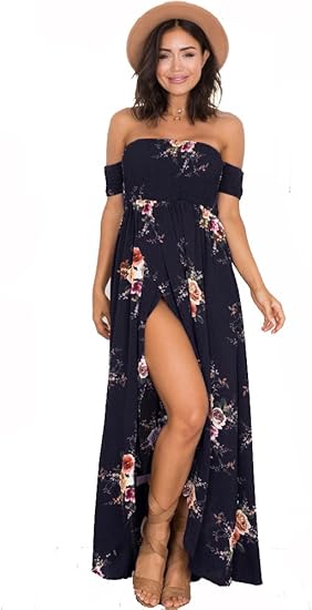 Yulun Women S Sexy Summer Dress Off Shoulder Floral Print Dress Strapless Split Maxi Beach Dress Amazon Ca Clothing Accessories