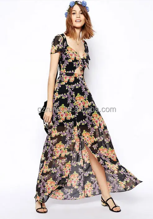 Hot Selling Long Summer Dress Short Sleeve Floral Printing Sexy