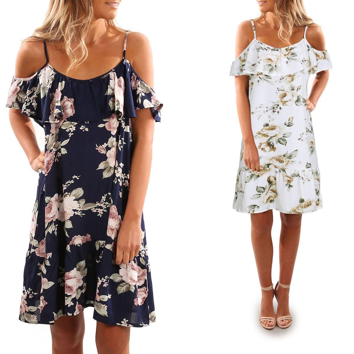 Women Summer Dress Cold Shoulder Floral Mini Dress Spaghetti Strap