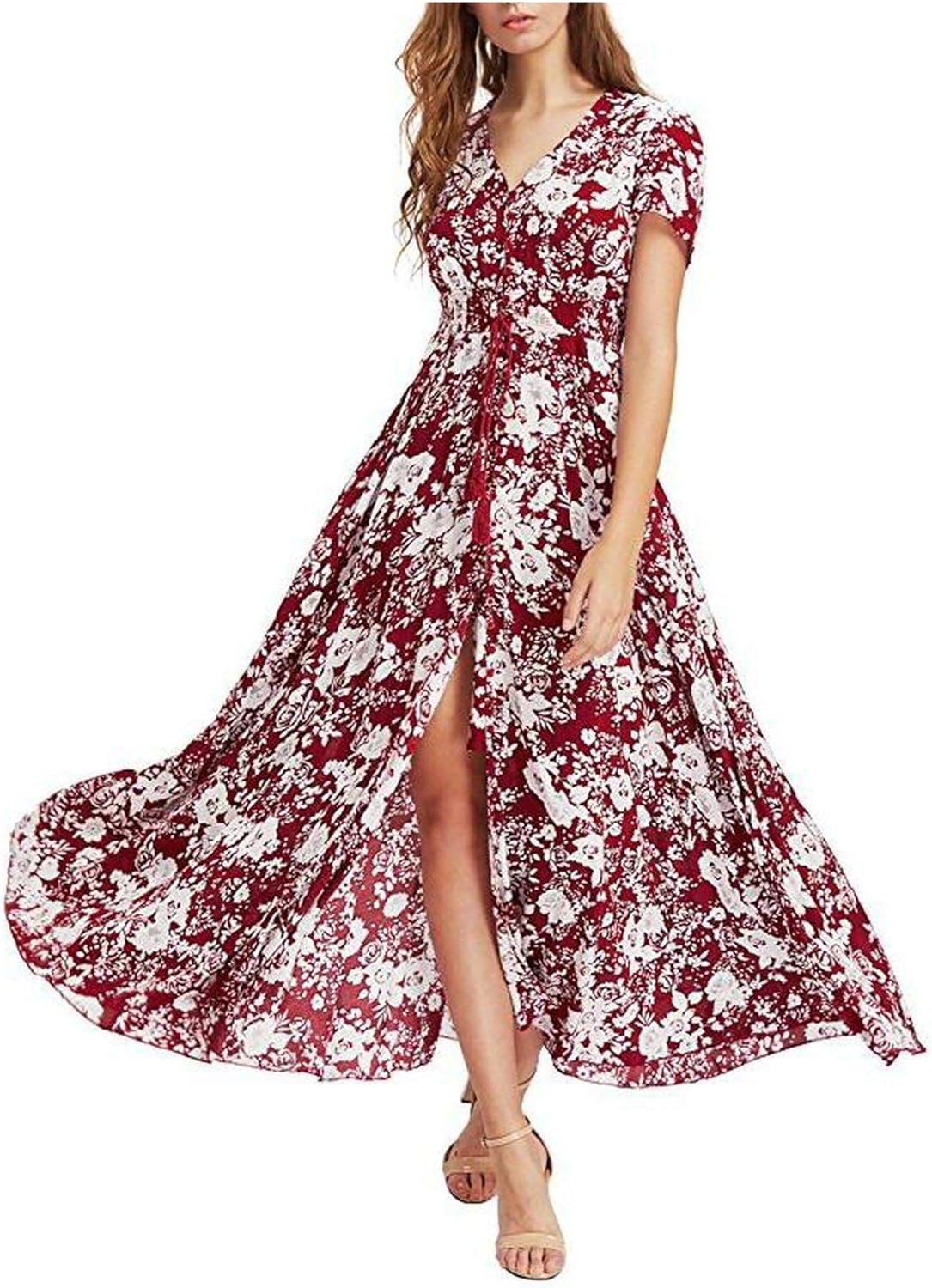 Ladies Summer Dress Women Maxi Sundress Button Up Split Floral