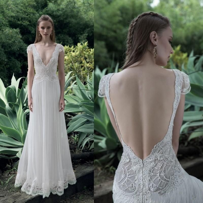 Discount Cheap Lace 2018 New Wedding Dress Boho Deep V Neck Bridal