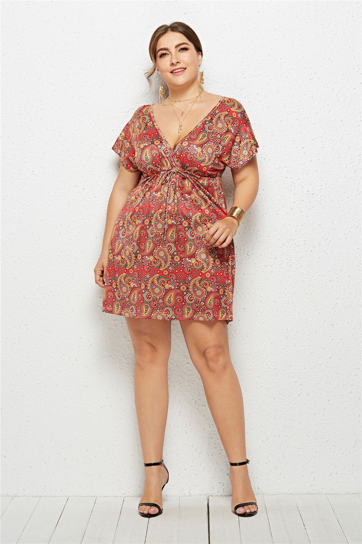 In Stock Women Summer Dress Plus Size Fashion V Neck Digital Print