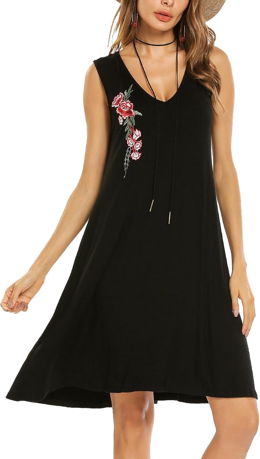 Women Floral Embroidered V Neck Tank Dress Summer Loose Casual