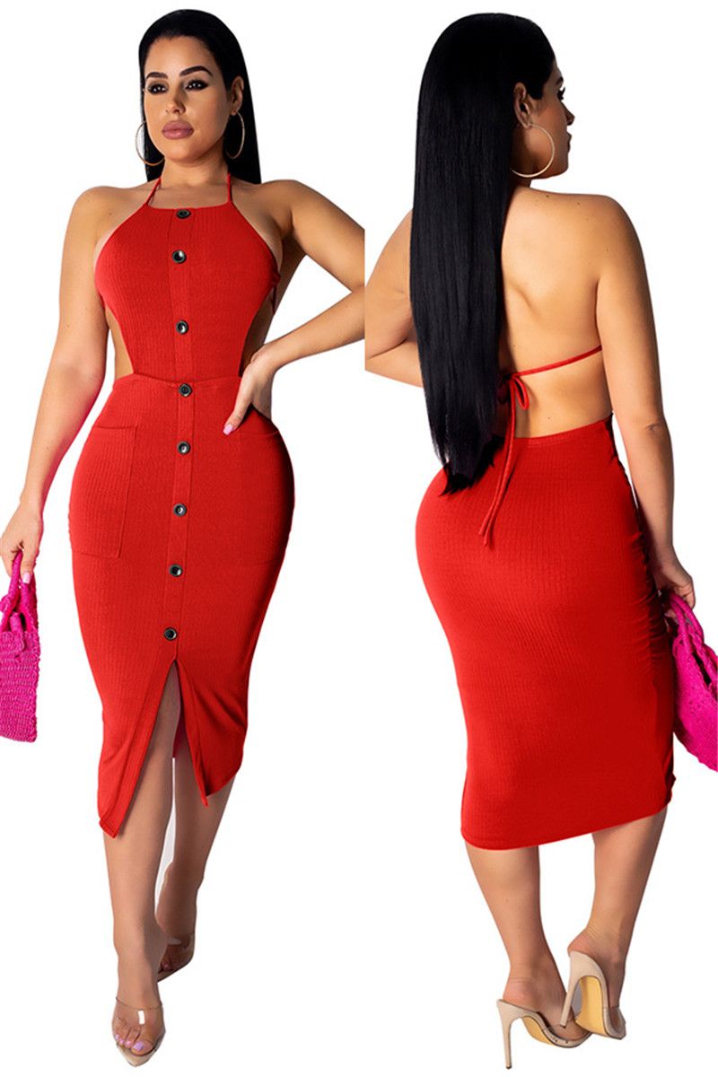Newasia Sexy Backless Bodycon Dress Women Ribbed Knit Metal