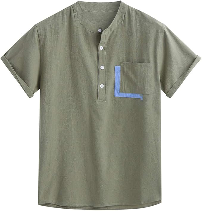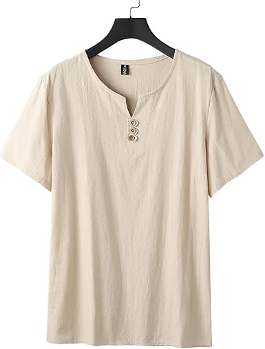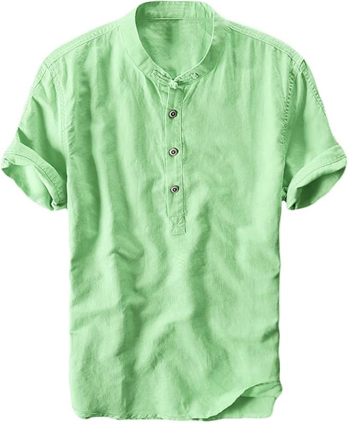Mens Henley T Shirt Linen Cotton Shirts Button Up Beach Tops