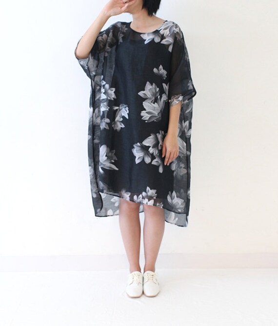 Black Silk Linen Dress Summer Dress Loose Dress Tunic Flower Etsy