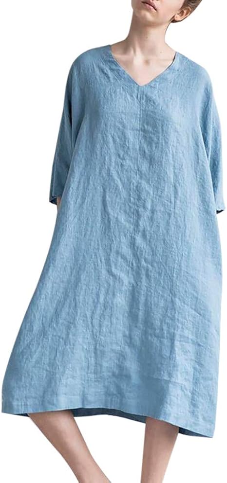 Amazon Com Women S Midi Cotton Linen Dress 3 4 Sleeve V Neck