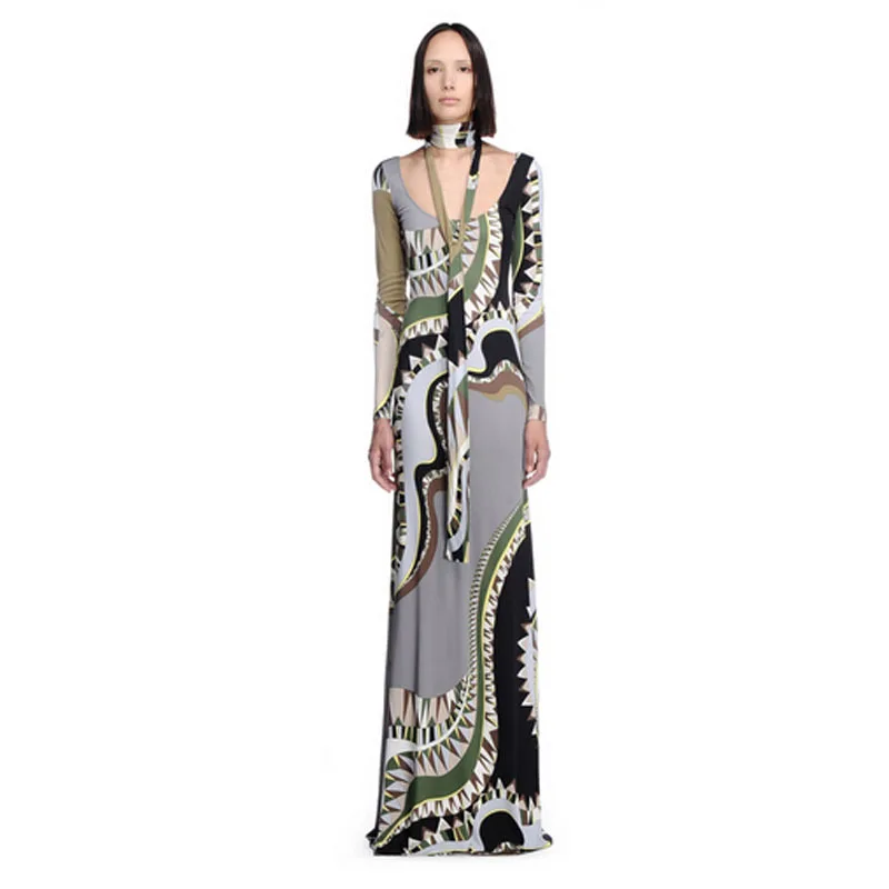 New Arrival Elegant Printed Stretch Jersey Long Sleeve Slim Maxi