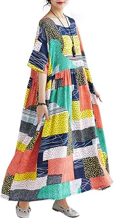 Romacci Women Boho Cotton Long Dress Summer Dot Print Color Block