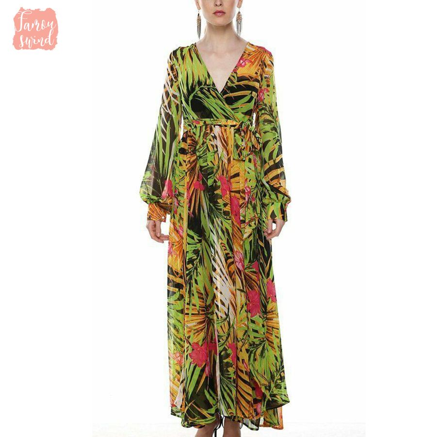 Women Holiday Print Long Dress Ladies Long Sleeve V Neck Evening