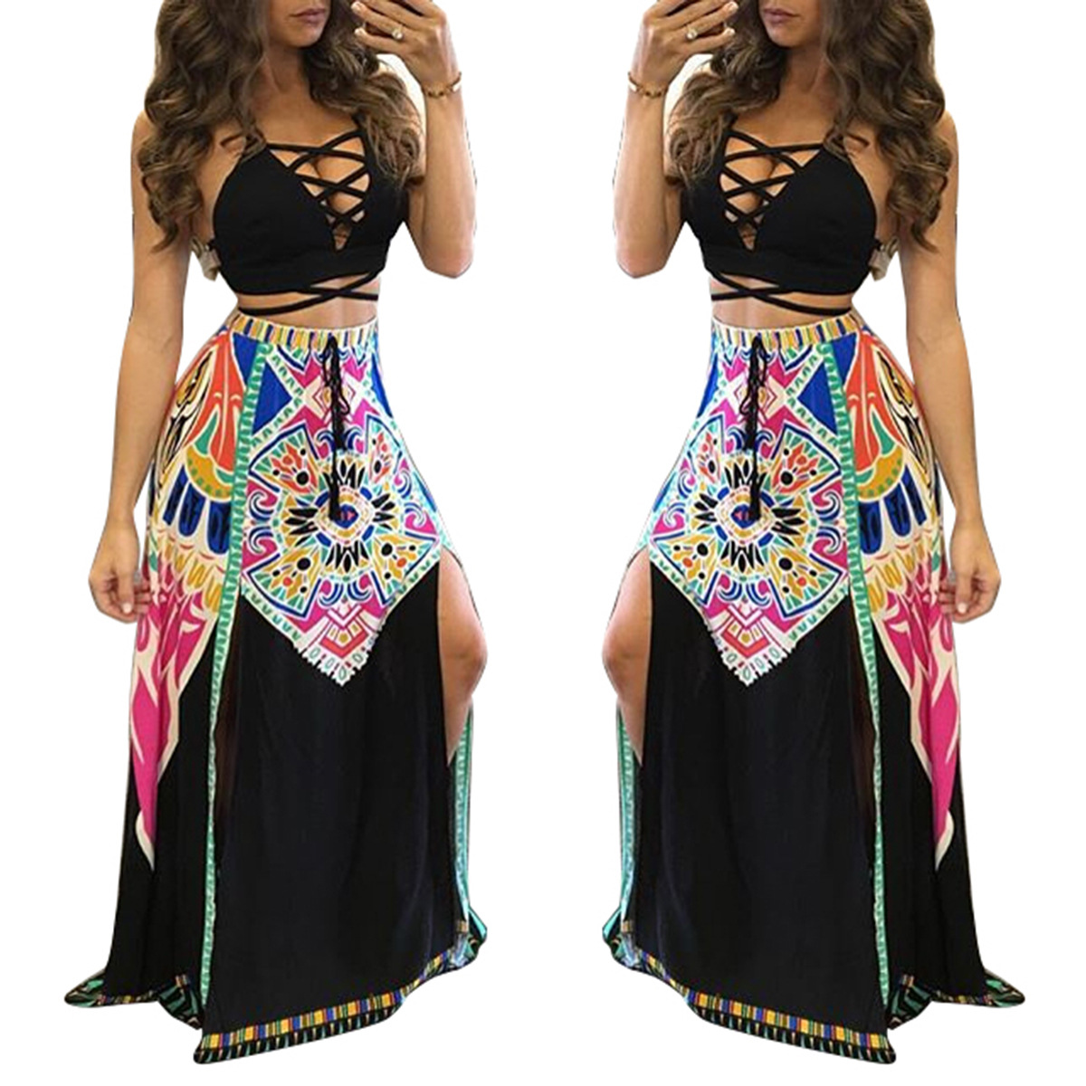Fashion Bohemian Crop Top Sexy Summer Two Piece Maxi Dress