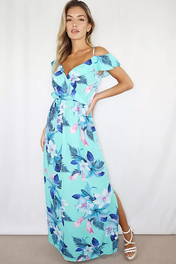 Aqua And Pink Floral Cold Shoulder Maxi Dress Quiz Clothing