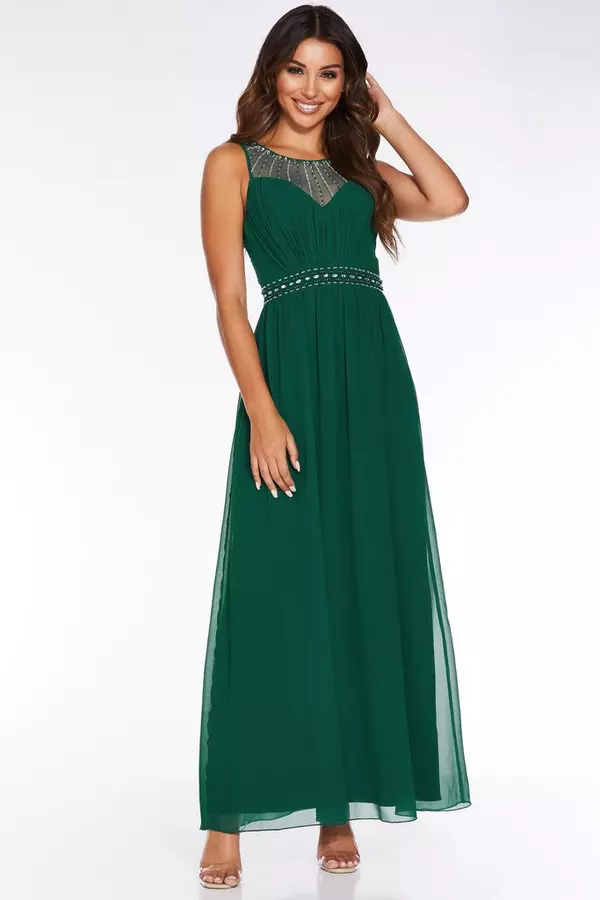 Bottle Green Chiffon High Neck Embellished Maxi Dress Quiz Clothing
