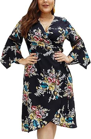 Casual Flower Print V Neck Wrap Dress Women Long Sleeve Ruffles
