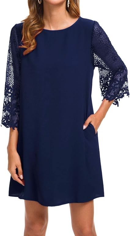 Top Vigor Casual Mini Dresses For Women Summer Crewneck Lace Half Sleeve Chiffon Tunic Dress Navy At Amazon Women S Clothing Store