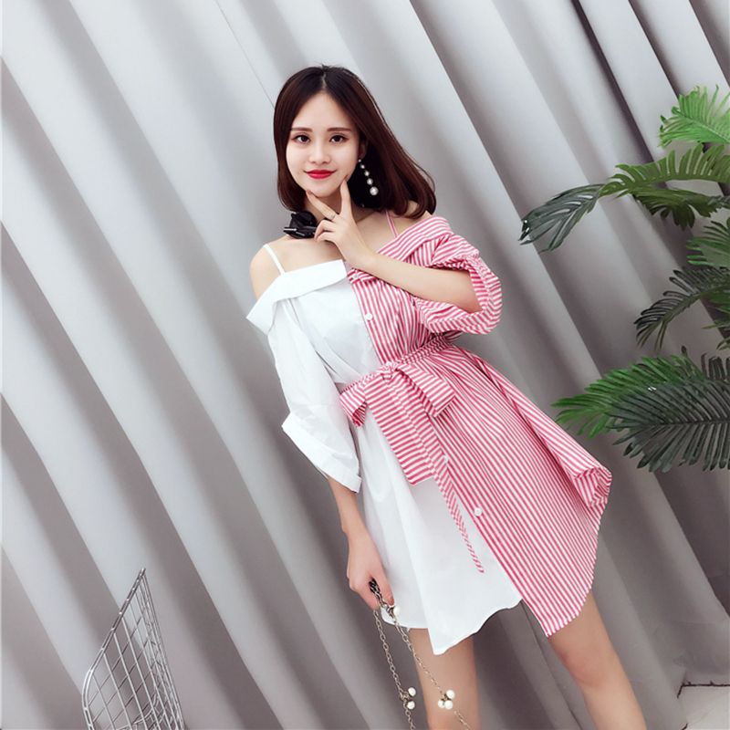 2017 Summer New Korean Fashion Female Irregular Collar Striped