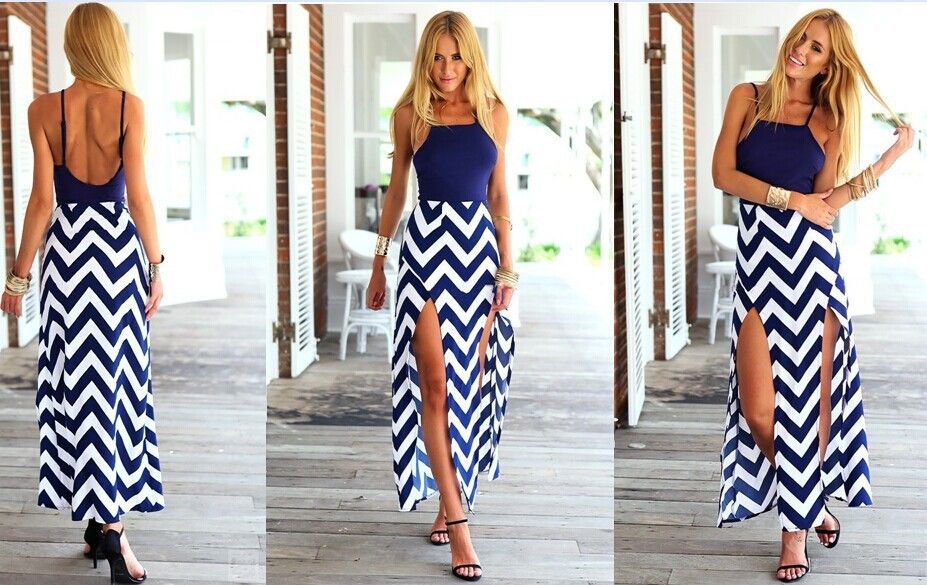Wave Striped Long Summer Dress Female Sexy Back Cut Out Long Maxi