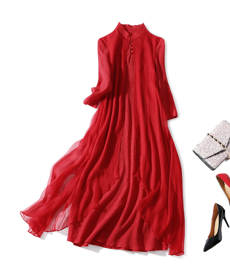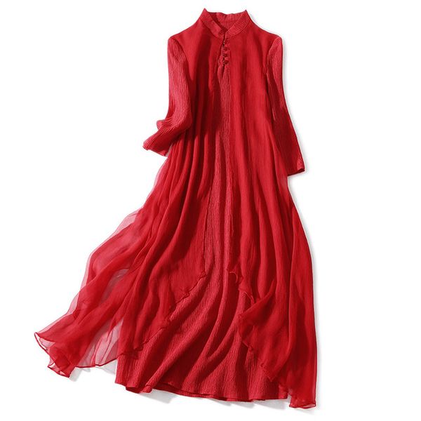 New Summer 100 Silk Red Dress Women Chinese Style Button