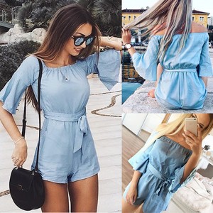 2018 Short Rompers Women Jumpsuits Summer Ladies Light Blue Sexy