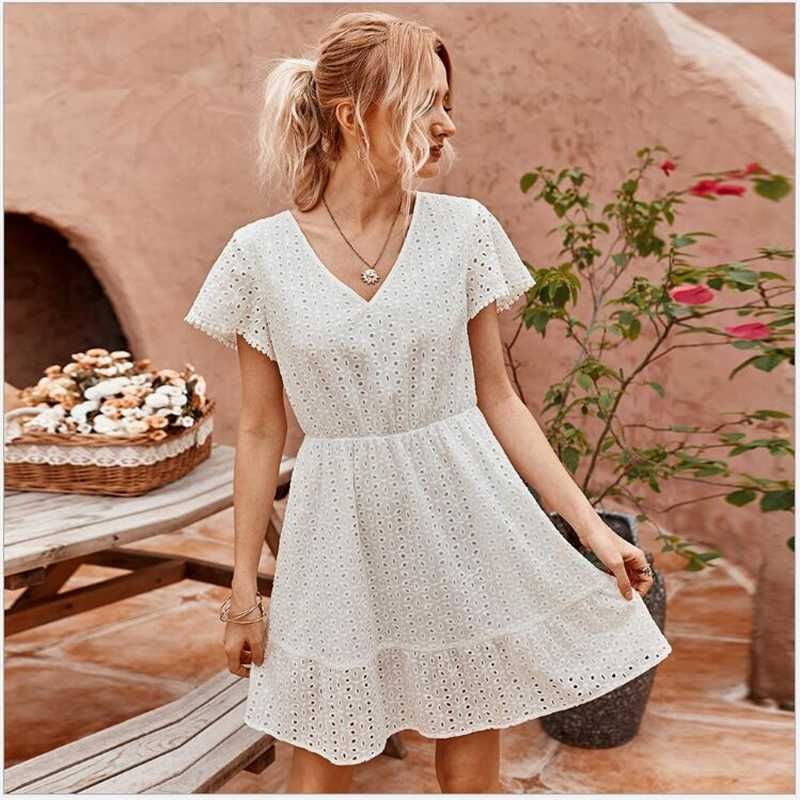 2020 Summer Elegant Hollow Out Embroidery Casual White Mini Dress