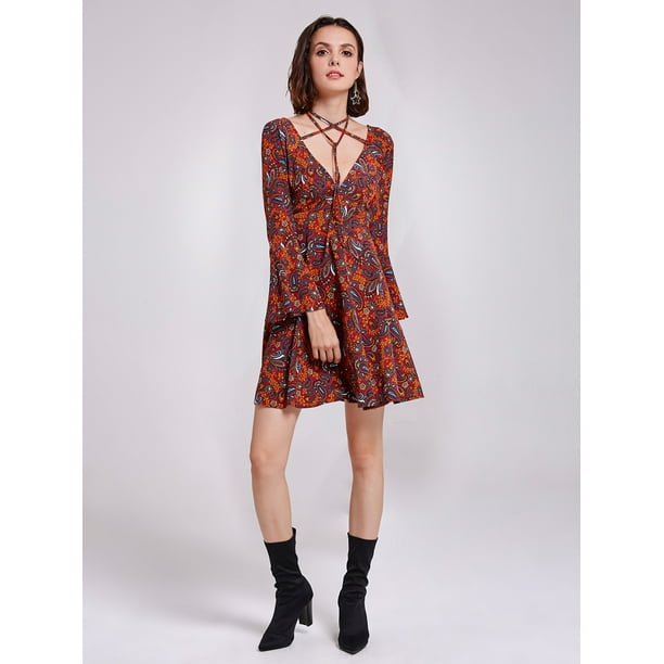 Womens Fit And Flare Print V Neck Dress Holiday Summer Floral