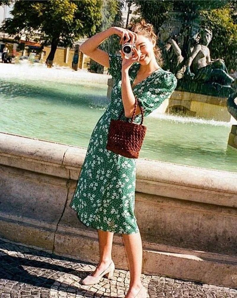 2020 2019 New Women Green Flower Print Wrap Dress Short Puff