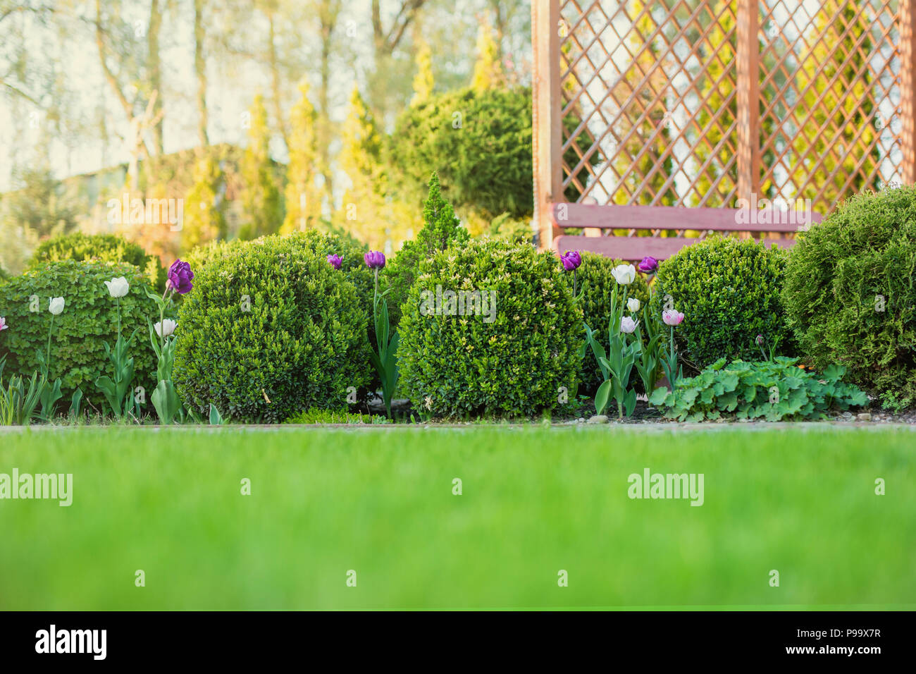 Beautiful Green Garden With Frsesh Boxwood Bushes Flowers And