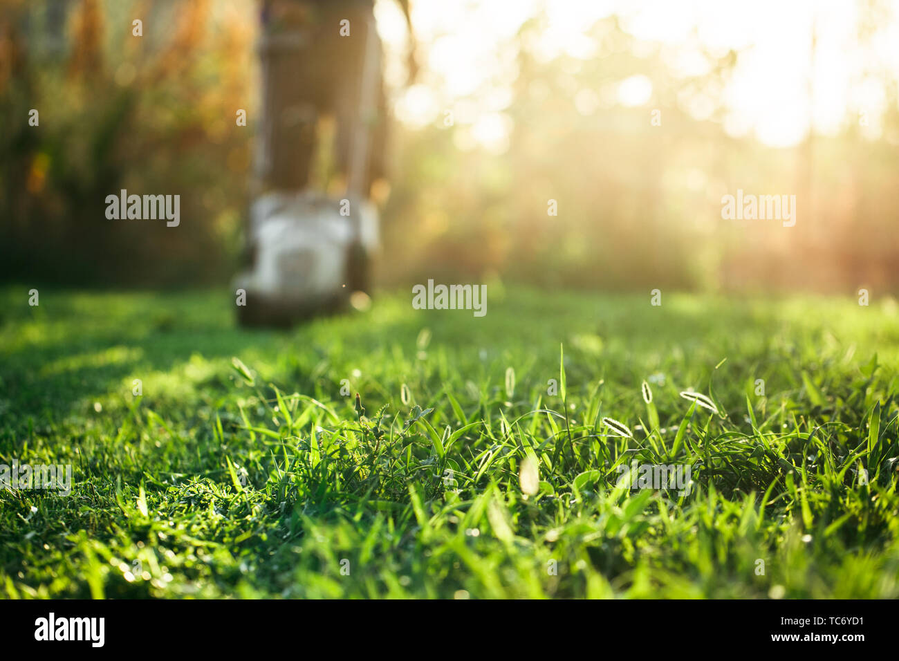 Lawn Mower Cutting Green Grass In Backyard Summer And Spring