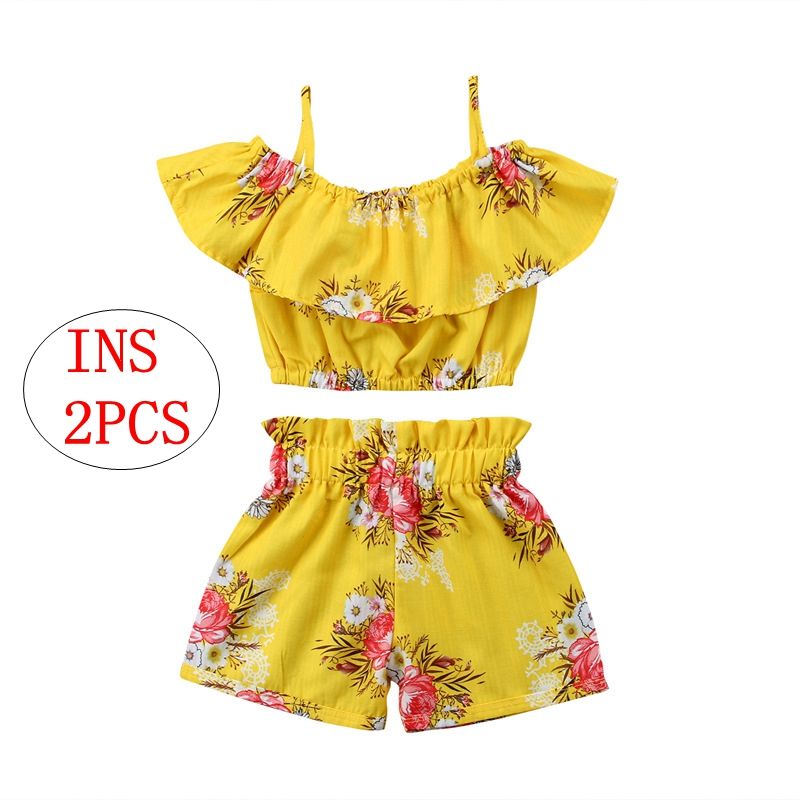 2020 Girl Summer Clothes Children Yellow Flowers Print Set Kid