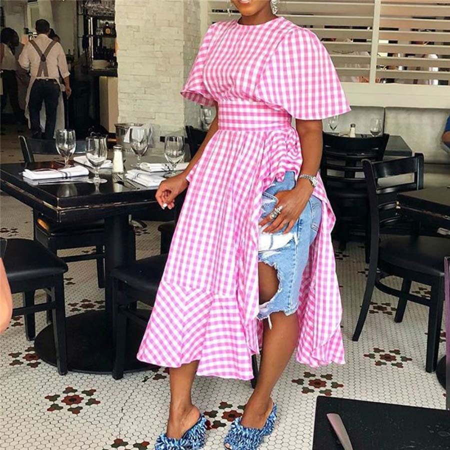 Women Ruffles Summer Dress Women Two Side Split Plaid Tall Waist