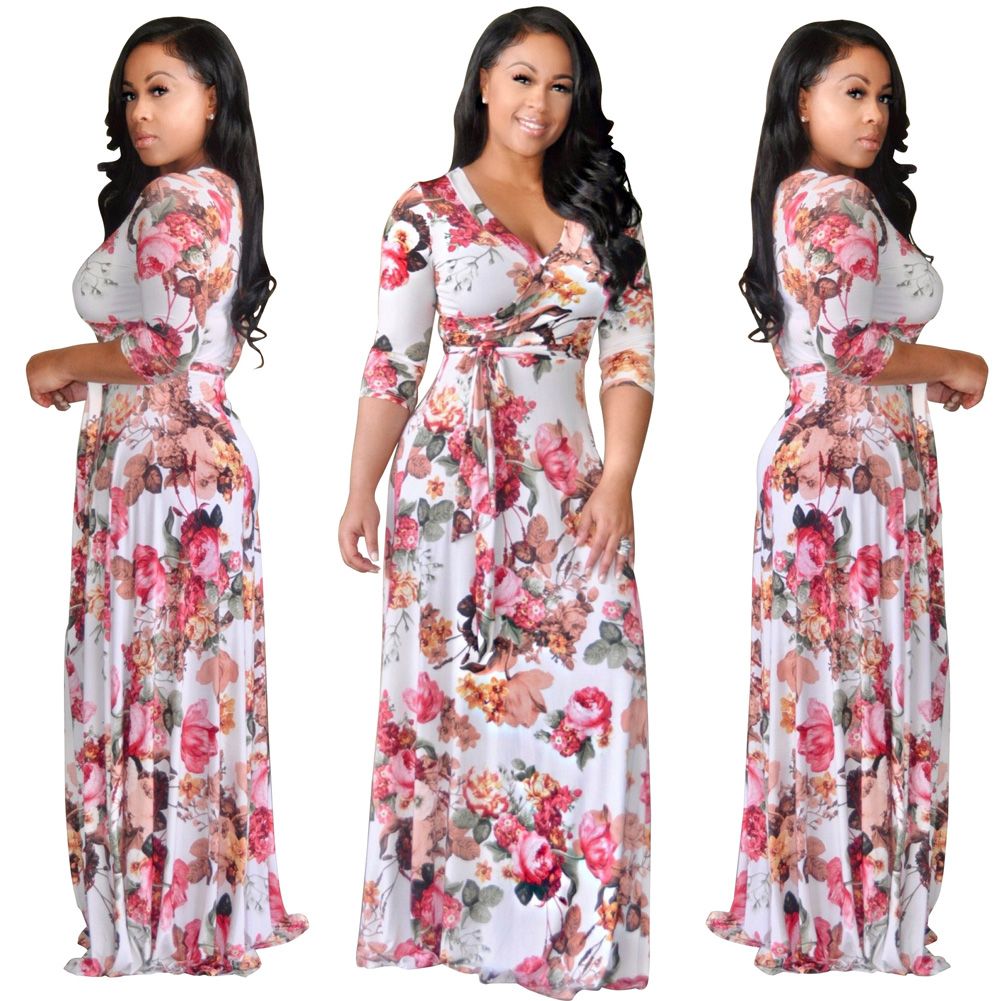 Long Floral Dress 2020 Summer V Neck Printed Three Quarter Sleeve