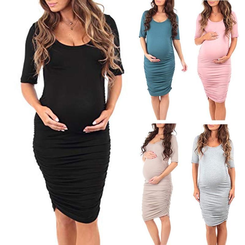 Pregnant Tight Open Long Dress Women Solid O Neck Short Sleeve