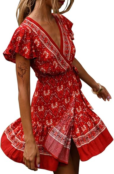 Floral Summer Dresses Red Mini Dress V Neck Short Sleeve Shaping