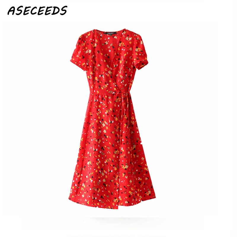 2020 Bohemian Vintage Red Summer Dress Women V Neck Casual Sexy