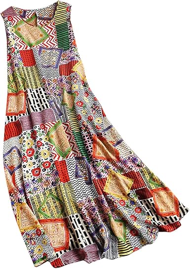 Women Summer Maxi Dress Vintage Print Floral Patch Dresses