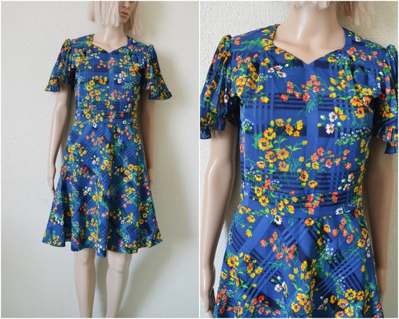 Floral Mini Dress Blue Orange Colourful Vintage Summer Dress Etsy