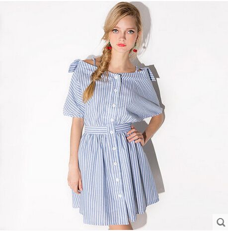 Summer Blue And White Stripe Shirt Dress Off Shoulder Fashion