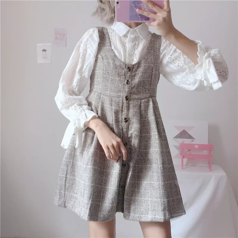 Cute Japanese Lolita 2 Pieces White Lace Long Sleeve Blouse Plaid