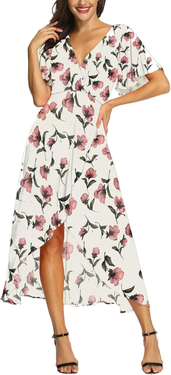 Azalosie Wrap Maxi Dress Short Sleeve V Neck Floral Flowy Front