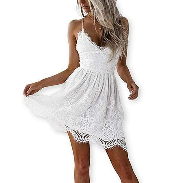 Freshlook Women White Summer V Neck Spaghetti Straps Lace Knee