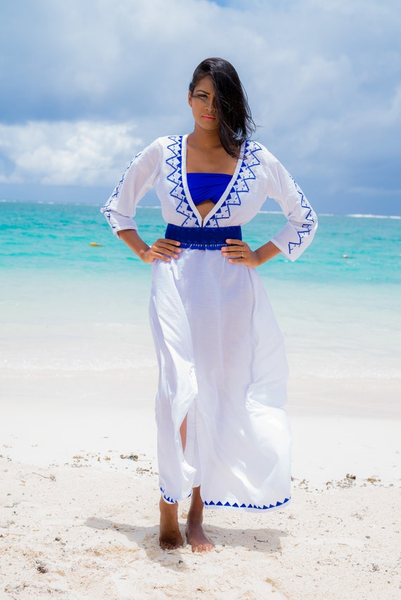 Dress Summer Dress White Dress Summer Embroidered White Blue Blue And White Embroidered Pom Poms Tassel Embroidered Dress Blue And White Embellished Dress Blue Embroidery Wheretoget